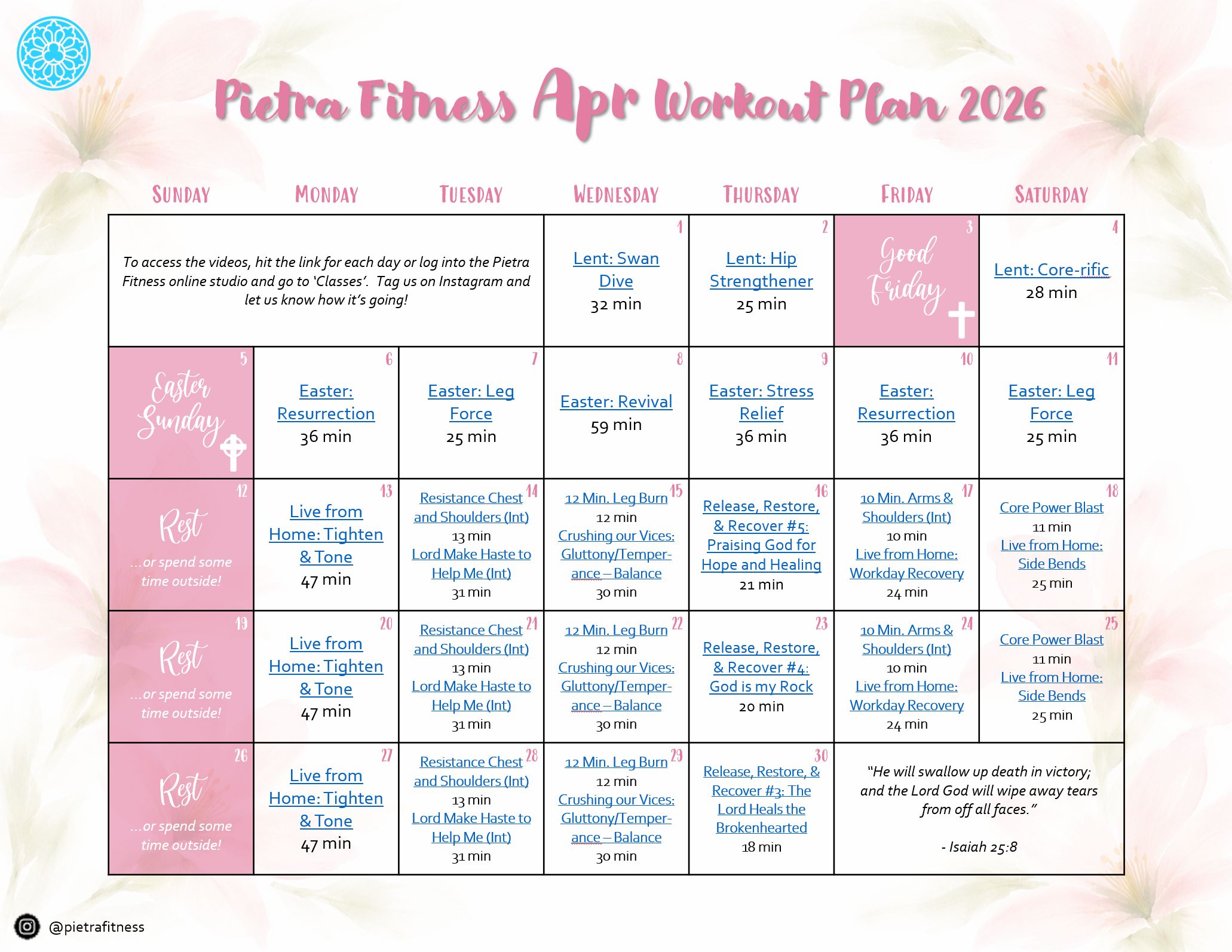 Each month we provide you with a free, interactive workout calendar plan, as well as additional plans you may wish to follow. As with all the videos in our online studio, you can do any classes in these plans at any time and in any order. But if you are someone who wants to eliminate the guesswork of putting together a fitness routine, our plans have got you covered. Download and print it out, or click on the links in the PDF to be taken right to the video. You must be logged in for the links to work.