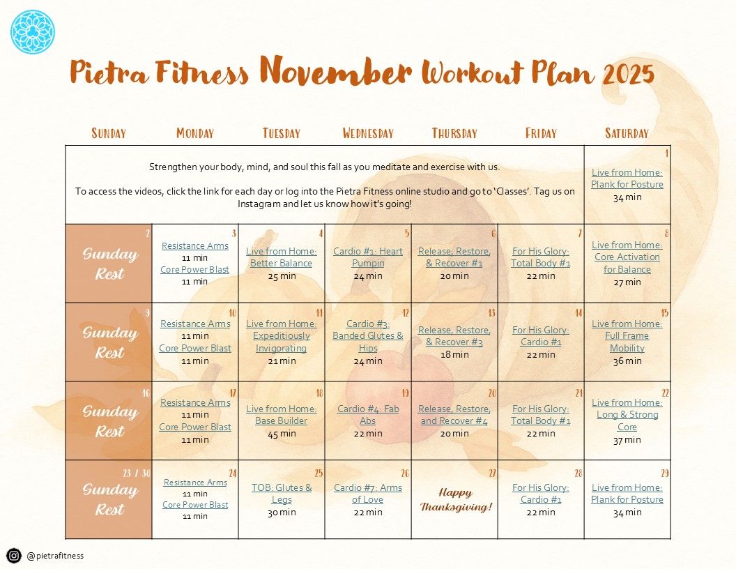 Each month we provide you with a free, interactive workout calendar plan, as well as additional plans you may wish to follow. As with all the videos in our online studio, you can do any classes in these plans at any time and in any order. But if you are someone who wants to eliminate the guesswork of putting together a fitness routine, our plans have got you covered. Download and print it out, or click on the links in the PDF to be taken right to the video. You must be logged in for the links to work.